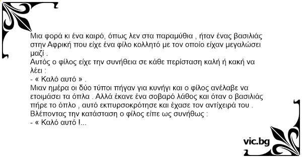 Μιαν ημέρα οι δύο τύποι πήγαν για κυνήγι και ο φίλος ανέλαβε να ετοιμάσει τα όπλα . Αλλά έκανε ένα σοβαρό λάθος και όταν ο βασιλιάς πήρε το όπλο , αυτό εκπυρσοκρότησε και έχασε τον αντίχειρά του . Βλέποντας την κατάσταση ο φίλος είπε ως συνήθως :