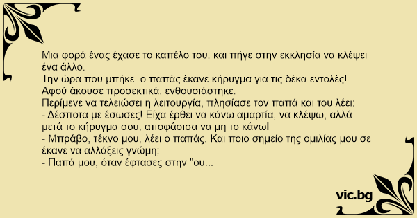 - Παπά μου, όταν έφτασες στην "ου μοιχεύσεις", θυμήθηκα που είχα αφήσει το καπέλο μου!