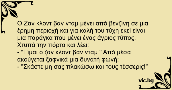 - "Είμαι ο ζαν κλοντ βαν νταμ." Από μέσα ακούγεται ξαφνικά μια δυνατή φωνή: