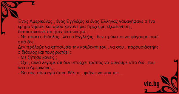 Ένας Αμερικάνος , ένας Εγγλέζος κι ένας Έλληνας ναυαγήσανε σ ένα έρημο νησάκι και αφού κάνανε μια πρόχειρη εξερεύνηση , διαπιστώσανε ότι ήταν ακατοίκητο .