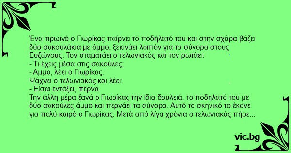 - Ρε Γιωρίκα πήρα σύνταξη τώρα, δεν θα το πω σε κανένα, πες μου σε παρακαλώ τόσα χρόνια τι περνούσες με τις σακούλες άμμου;