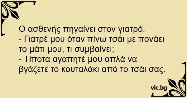 - Γιατρέ νιώθω πάντα αυτόν τον πόνο στο μάτι όταν πίνω τσάι. - Δοκιμάσατε να βγάλετε το κουταλάκι ;