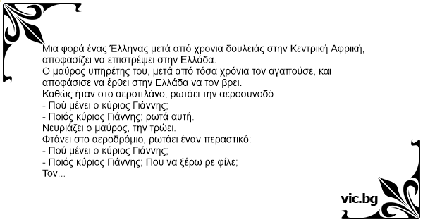 Μια φορά ένας Έλληνας μετά από χρονια δουλειάς στην Κεντρική Αφρική, αποφασίζει να επιστρέψει στην Ελλάδα.