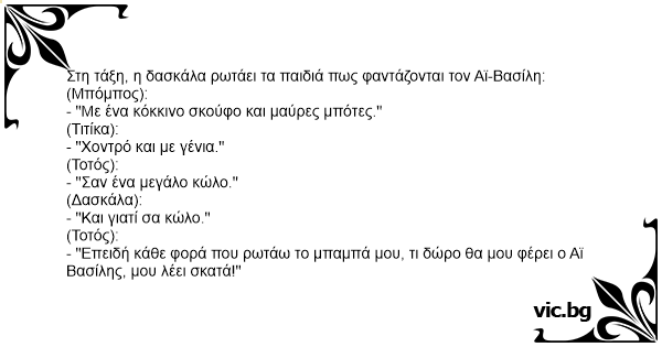 - "Επειδή κάθε φορά που ρωτάω το μπαμπά μου, τι δώρο θα μου φέρει ο Αϊ Βασίλης, μου λέει σκατά!"