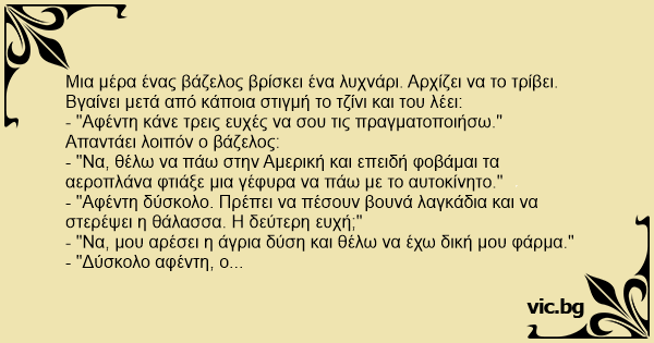Μια μέρα ένας βάζελος βρίσκει ένα λυχνάρι. Αρχίζει να το τρίβει. Βγαίνει μετά από κάποια στιγμή το τζίνι και του λέει:
