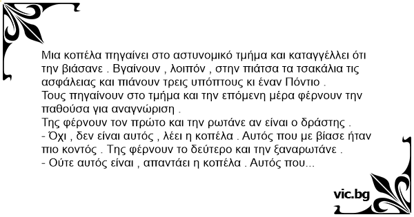 - Όχι , δεν είναι αυτός , λέει η κοπέλα . Αυτός που με βίασε ήταν πιο κοντός . Tης φέρνουν το δεύτερο και την ξαναρωτάνε .