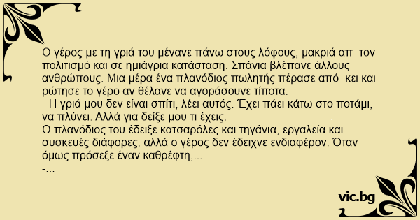Ο πλανόδιος του έδειξε κατσαρόλες και τηγάνια, εργαλεία και συσκευές διάφορες, αλλά ο γέρος δεν έδειχνε ενδιαφέρον. Όταν όμως πρόσεξε έναν καθρέφτη,...