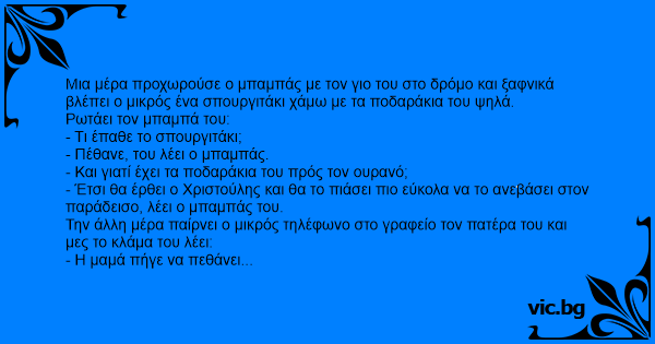- Έτσι θα έρθει ο Χριστούλης και θα το πιάσει πιο εύκολα να το ανεβάσει στον παράδεισο, λέει ο μπαμπάς του.