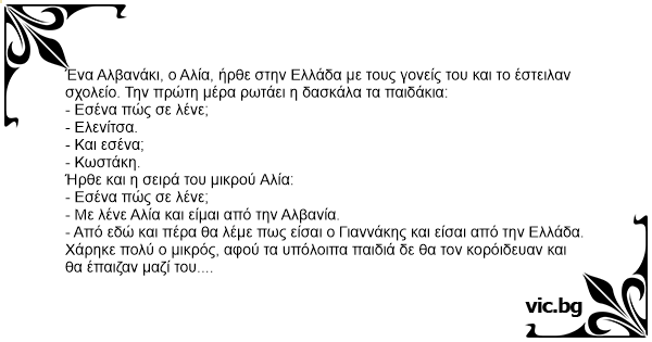 Ένα Αλβανάκι, ο Αλία, ήρθε στην Ελλάδα με τους γονείς του και το έστειλαν σχολείο. Την πρώτη μέρα ρωτάει η δασκάλα τα παιδάκια: