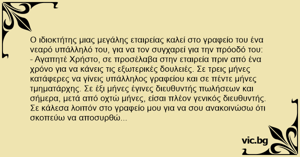 - Αγαπητέ Χρήστο, σε προσέλαβα στην εταιρεία πριν από ένα χρόνο για να κάνεις τις εξωτερικές δουλειές. Σε τρεις μήνες κατάφερες να γίνεις υπάλληλος γραφείου και σε πέντε μήνες τμηματάρχης. Σε έξι μήνες έγινες διευθυντής πωλήσεων και σήμερα, μετά από οχτώ μήνες, είσαι πλέον γενικός διευθυντής. Σε κάλεσα λοιπόν στο γραφείο μου για να σου ανακοινώσω ότι σκοπεύω να αποσυρθώ και να αφήσω την εταιρεία στα χέρια σου. Τι έχεις να πεις για όλα αυτά;