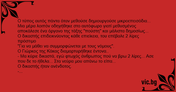 - Μα κύριε δικαστά, εγώ φτωχός άνθρωπος πού να βρω 2 λίρες... Ασε που δε το ήθελα... Στα νεύρα μου απάνω το είπα...