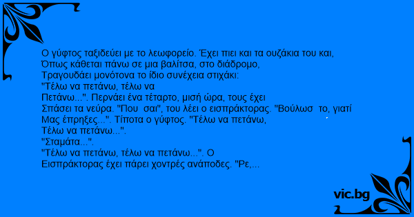 Μας έπρηξες...". Τίποτα ο γύφτος. "Τέλω να πετάνω,