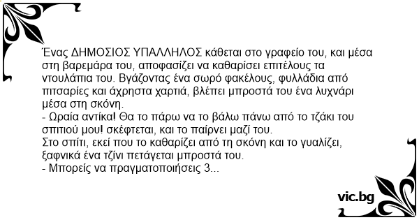 Ένας ΔΗΜΟΣΙΟΣ ΥΠΑΛΛΗΛΟΣ κάθεται στο γραφείο του, και μέσα στη βαρεμάρα του, αποφασίζει να καθαρίσει επιτέλους τα ντουλάπια του. Βγάζοντας ένα σωρό φακέλους, φυλλάδια από πιτσαρίες και άχρηστα χαρτιά, βλέπει μπροστά του ένα λυχνάρι μέσα στη σκόνη.