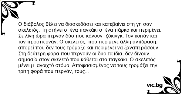 Ο διάβολος θέλει να διασκεδάσει και κατεβαίνει στη γη σαν σκελετός. Τη στήνει σ ένα παγκάκι σ ένα πάρκο και περιμένει. Σε λίγη ώρα περνάν δύο που κάνουν τζόκινγκ. Τον κοιτάν και τον προσπερνάν. Ο σκελετός, που περίμενε άλλη αντίδραση, απορεί που δεν τους τρόμαξε και περιμένει να ξαναπεράσουν. Στη δεύτερη φορά που περνούν οι δυο τα ίδια, δεν δίνουν σημασία στον σκελετό που κάθεται στο παγκάκι. Ο σκελετός μένει μ ανοιχτό στόμα. Αποφασισμένος να τους τρομάξει την τρίτη φορά που περνάν, τους πλησιάζει και τους ρωτάει κρατώντας ένα τσιγάρο: