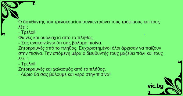 Ζητοκραυγές από το πλήθος. Ευχαριστημένοι όλοι άρχισαν να παίζουν στην πισίνα. Την επόμενη μέρα ο διευθυντής τους μαζεύει πάλι και τους λέει :