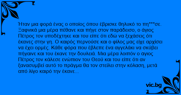 Ξαφνικά μια μέρα πέθανε και πήγε στον παράδεισο, ο άγιος Πέτρος τον υποδέχτηκε και του είπε ότι εδώ να ξεχάσεις ότι έκανες στην γη. Ο καιρός περνούσε και ο φίλος μας είχε αρχίσει να έχει ορμές. Κάθε φόρα που έβλεπε ένα αγγελάκι να σκύβει πήγαινε και του έκανε την δουλειά. Μια μέρα λοιπόν ο άγιος Πέτρος τον κάλεσε ενώπιον του Θεού και του είπε ότι αν ξανασυμβεί αυτό το πράγμα θα τον στείλει στην κόλαση, μετά από λίγο καιρό την έκανε και του άγιου Πέτρου έτσι λοιπόν τον έστειλε στην κόλαση. Πέρασε λίγος καιρός και ο άγιος Πέτρος είχε αγωνία να δει τι κάνει ο επιβήτορας και έτσι αποφάσισε να πάει ο ίδιος να δει τι απέγινε, πάει λοιπόν στην κόλαση αλλά δεν είδε τα καζάνια να ανάβουν και του φάνηκε παράξενο φωνάζει λοιπόν του Βελζεβούλ και τον ρωτάει γιατί δεν ανάβουν τα καζάνια και ο Βελζεβούλ του λέει: Τα σπίρτα είναι κάτω άμα θες σκύψε να πάρεις ένα για να τα ανάψεις.