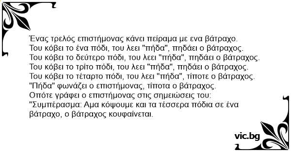 "Συμπέρασμα: Αμα κόψουμε και τα τέσσερα πόδια σε ένα βάτραχο, ο βάτραχος κουφαίνεται.