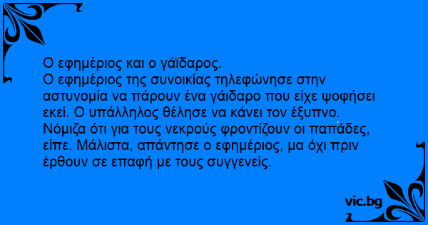 En morgon när prästen skulle gå till jobbet hittade han en död gris vid sidan av vägen. Han ringde polisen och berättade om grisen. Då sa polisen som ville göra sig rolig: - Jag trodde ni präster... Op een morgen doet een pastoor de deur van zijn kerk open en vindt daar een dode ezel. Hij weet niet goed wat doen en belt dan de burgemeester maar op met het verzoek om het dier te laten weghalen.... Свещеник звъни в полицията: - Ало, обажда се отец Иван, искам да ви уведомя, че намерих мъртво магаре на пътя... - И какво, отче, прочете ли му молитва? - Не, реших първо на роднините да кажа. Um burro morreu bem em frente duma Igreja e, como uma semana depois, o corpo ainda estava lá, o padre resolveu reclamar com o Prefeito. — Prefeito, tem um burro morto na frente da Igreja há quase... Een pastoor vindt een dode ezel voor zijn deur. Hij belt de burgemeester op en verzoekt hem het dier weg te halen. "Daar heb ik niks mee te maken", zegt de burgemeester, die een gloeiende hekel aan... Ein Pfarrer ruft beim Gesundheitsamt an: "Eines meiner Schäfchen hat mir soeben berichtet, dass auf der Autobahn ein toter Esel liege." Der Beamte, ein Scherzbold, antwortet: "Herr Pfarrer, ich... Un día en un pueblo apareció muerto un burro frente a la iglesia, y pasaban los días y nadie lo recogía, y el cura muy molesto llama al alcalde y le dice: Señor alcalde, usted como alcalde por qué no manda que recojan ese burro. El alcalde que no estaba ese día de muy buen humor le responde: Y... Се вози попот со кола и наидува на мртво магаре на патот. Се јавува во полиција: - Се јавува попот. Има едно мртво магаре на патот па се јавувам да го отстраните некој да не се истумба. Полицаецот,... Užeina kunigas į policijos nuovadą ir praneša, kad ant gatvės guli suvažinėtas šuo. Policininkas: - Tai, kunigėli, palaidokit jį ir tiek. - Žinoma, mes jį palaidosim, bet pamaniau, kad giminėms... Intr-un Sat, un preot merge la slujba. Langa biserica, vede Un magar mort intr-un accident de masina si Suna imediat la politie. - Sunt preotul satului. Am Gasit un magar mort. - Si ce, zice...
