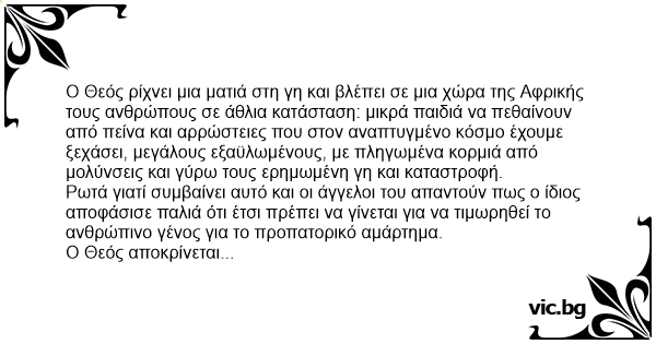 Ο Θεός αποκρίνεται απορημένος: Μα εγώ πλάκα έκανα. Ξανακοιτάζει στη γη και λίγο πιο πάνω στην υδρόγειο βλέπει κάτι καθολικούς ιερείς που περνούσαν ζωή χαρισάμενη.