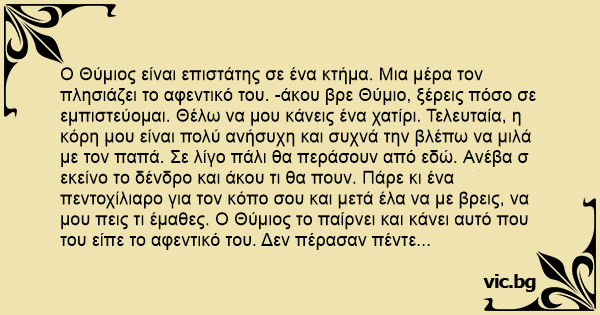 Ο Θύμιος είναι επιστάτης σε ένα κτήμα. Μια μέρα τον πλησιάζει το αφεντικό του. -άκου βρε Θύμιο, ξέρεις πόσο σε εμπιστεύομαι. Θέλω να μου κάνεις ένα χατίρι. Τελευταία, η κόρη μου είναι πολύ ανήσυχη και συχνά την βλέπω να μιλά με τον παπά. Σε λίγο πάλι θα περάσουν από εδώ. Ανέβα σ εκείνο το δένδρο και άκου τι θα πουν. Πάρε κι ένα πεντοχίλιαρο για τον κόπο σου και μετά έλα να με βρεις, να μου πεις τι έμαθες. Ο Θύμιος το παίρνει και κάνει αυτό που του είπε το αφεντικό του. Δεν πέρασαν πέντε λεπτά και βλέπει τον ιερέα με την κόρη του αφεντικού να πλησιάζουν. -Πάτερ μου, δεν άκουσα την συμβουλή σας για εκείνο τον νέο και... πώς να σας το πω; -Λέγε παιδί μου. Τι είναι αυτό που σε στενοχωρεί; -Να... φοβάμαι ότι περιμένω παιδί... -Αμάρτησες αλλά μην ανησυχείς παιδί μου. Αυτός που βρίσκεται εκεί ψηλά και τα βλέπει όλα, θα φροντίσει και για αυτό το παιδί. Πηδάει τρομαγμένος ο Θύμιος από το δένδρο και φωνάζει τρέχοντας: