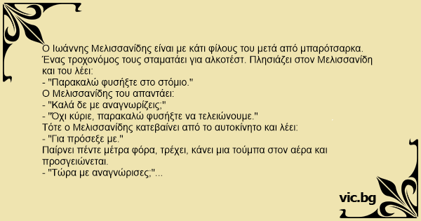 Ο Ιωάννης Μελισσανίδης είναι με κάτι φίλους του μετά από μπαρότσαρκα. Ένας τροχονόμος τους σταματάει για αλκοτέστ. Πλησιάζει στον Μελισσανίδη και του λέει: