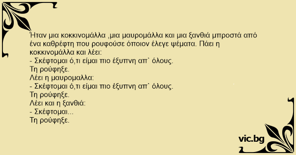 Havia um espelho mágico cuja característica especial era fazer desaparecer qualquer pessoa que dissesse uma mentira na sua frente. Certo dia, três mulheres vieram se consultar com ele: uma morena, uma ruiva e uma loira. A morena olha o espelho e diz: — Eu penso que sou a mais linda mulher do...