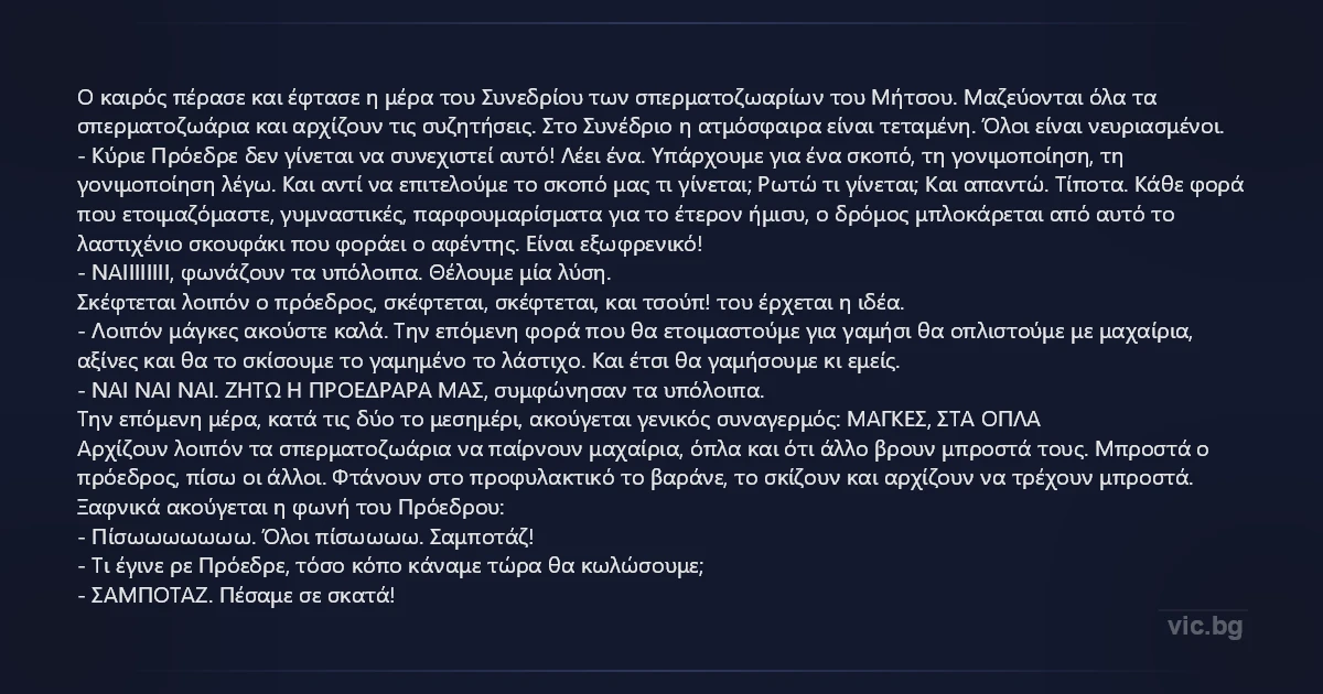 Ο καιρός πέρασε και έφτασε η μέρα του Συνεδρίου των σπερματοζωαρίων του Μήτσου. Μαζεύονται όλα τα σπερματοζωάρια και αρχίζουν τις συζητήσεις. Στο Συνέδριο η ατμόσφαιρα είναι τεταμένη. Όλοι είναι νευριασμένοι. - Κύριε Πρόεδρε δεν γίνεται να συνεχιστεί αυτό! Λέει ένα. Υπάρχουμε για ένα σκοπό, τη γονιμοποίηση, τη γονιμοποίηση λέγω. Και αντί να επιτελούμε το σκοπό μας τι γίνεται; Ρωτώ τι γίνεται; Και απαντώ. Τίποτα. Κάθε φορά που ετοιμαζόμαστε, γυμναστικές, παρφουμαρίσματα για το έτερον ήμισυ, ο δρόμος μπλοκάρεται από αυτό το λαστιχένιο σκουφάκι που φοράει ο αφέντης. Είναι εξωφρενικό! - ΝΑΙΙΙΙΙΙΙΙ, φωνάζουν τα υπόλοιπα. Θέλουμε μία λύση. Σκέφτεται λοιπόν ο πρόεδρος, σκέφτεται, σκέφτεται, και τσούπ! του έρχεται η ιδέα. - Λοιπόν μάγκες ακούστε καλά. Την επόμενη φορά που θα ετοιμαστούμε για γαμήσι θα οπλιστούμε με μαχαίρια, αξίνες και θα το σκίσουμε το γαμημένο το λάστιχο. Και έτσι θα γαμήσουμε κι εμείς. - ΝΑΙ ΝΑΙ ΝΑΙ. ΖΗΤΩ Η ΠΡΟΕΔΡΑΡΑ ΜΑΣ, συμφώνησαν τα υπόλοιπα. Την επόμενη μέρα, κατά τις δύο το μεσημέρι, ακούγεται γενικός συναγερμός: ΜΑΓΚΕΣ, ΣΤΑ ΟΠΛΑ Αρχίζουν λοιπόν τα σπερματοζωάρια να παίρνουν μαχαίρια, όπλα και ότι άλλο βρουν μπροστά τους. Μπροστά ο πρόεδρος, πίσω οι άλλοι. Φτάνουν στο προφυλακτικό το βαράνε, το σκίζουν και αρχίζουν να τρέχουν μπροστά. Ξαφνικά ακούγεται η φωνή του Πρόεδρου: - Πίσωωωωωωω. Όλοι πίσωωωω. Σαμποτάζ! - Τι έγινε ρε Πρόεδρε, τόσο κόπο κάναμε τώρα θα κωλώσουμε; - ΣΑΜΠΟΤΑΖ. Πέσαμε σε σκατά!