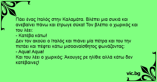 Πάει ένας Ιταλός στην Καλαμάτα. Βλέπει μια συκιά και ανεβαίνει πάνω και έτρωγε σύκα! Τον βλέπει ο χωρικός και του λέει: