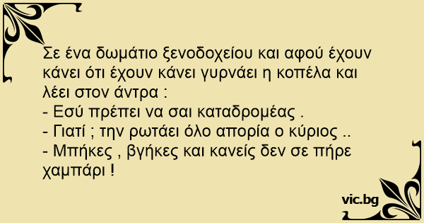 Nākamajā rītā pēc pirmās nakts. Viņa: ?Kāda īsti ir tava profesija?? Viņš: ?Anesteziologs.? Viņa: ?Tagad skaidrs, kāpēc es neko nejutu.?