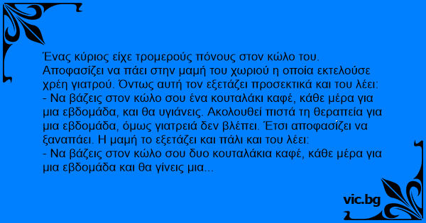 - Να βάζεις στον κώλο σου δυο κουταλάκια καφέ, κάθε μέρα για μια εβδομάδα και θα γίνεις μια χαρά. Ο κύριος κάνει ακριβώς αυτό αλλά μετά από μια εβδομάδα δεν έχει δει γιατρειά, οι πόνοι συνεχίζονται αφόρητοι. Έτσι αποφασίζει να πάει σε κανονικό γιατρό. Κλείνει ραντεβού, πηγαίνει, και εξηγεί τη κατάσταση. Ο γιατρός του ζητά να γδυθεί και να κάτσει στα τέσσερα για να τον εξετάσει. Η εξέταση αρχίζει και ο γιατρός είναι πολύ σκεπτικός. Κουνάει το κεφάλι του και δεν μιλάει. Όπως είναι φυσικό ο ασθενής είναι πολύ ανήσυχος. Δεν θέλει να διακόψει τον γιατρό, αλλά μετά από 15 λεπτά εξέτασης δεν αντέχει και ρωτάει γεμάτος αγωνία τον γιατρό:
