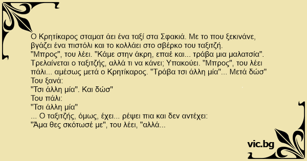 "Μπρος", του λέει. "Κάμε στην άκρη, επαέ και... τράβα μια μαλατσία". Τρελαίνεται ο ταξιτζής, αλλά τι να κάνει; Υπακούει. "Μπρος", του λέει πάλι... αμέσως μετά ο Κρητίκαρος. "Τράβα τσι άλλη μία"... Μετά δώσ"