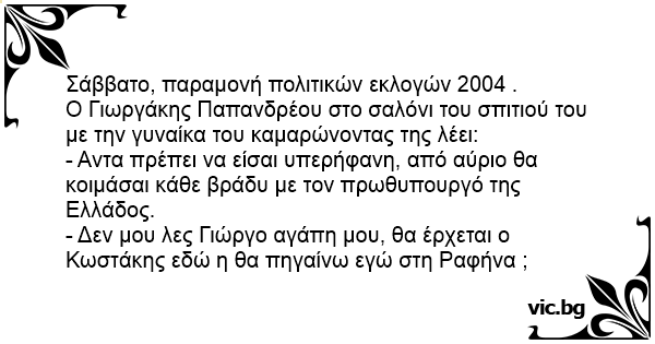 - Αντα πρέπει να είσαι υπερήφανη, από αύριο θα κοιμάσαι κάθε βράδυ με τον πρωθυπουργό της Ελλάδος.