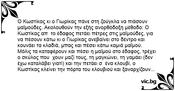 Όταν είχαν μαζευτεί καμιά τριανταριά, αποφάσισαν να πάνε για το σπίτι. Στο δρόμο όμως βλέπουν πάνω σ ένα δέντρο μια πολύ σπάνια μαϊμού. Αποφασίζουν να την πιάσουν. Ο Κωστίκας αρχίζει να πετάει πέτρες. Ο Γιωρίκας ανεβαίνει στο δέντρο και αρχίζει να κουνάει τα κλαδιά. Η μαϊμού δεν πέφτει όμως. Ο Γιωρίκας ανεβαίνει πιο ψηλά, σε πιο λεπτά κλαδιά και η κατάσταση γίνεται επικίνδυνη. Σε μια στιγμή βάζει τις φωνές.