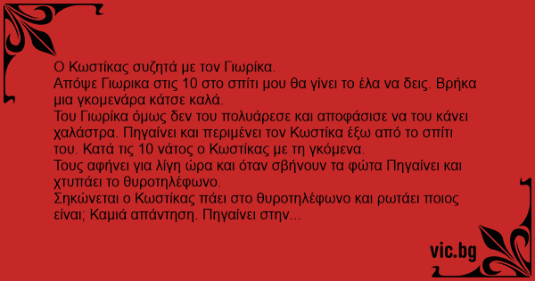 Σκέφτεται ο Γιωρίκας πολύ του την έσπασα θα ξαναχτυπήσω άλλη μια φορά θα πω ένα ψεύτικο όνομα και θα φύγω. Χτυπάει ξανά το θυροτηλέφωνο Σηκώνεται τώρα πιο πολύ εξαγριωμένος ο Κωστίκας, σηκώνει το θυροτηλέφωνο και ρωτάει. ποιος είναι ρε γαμώτο;