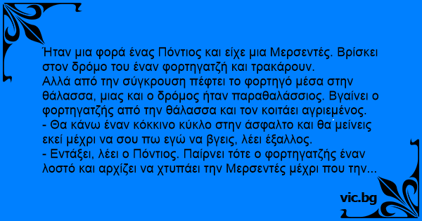 - Εντάξει, λέει ο Πόντιος. Παίρνει τότε ο φορτηγατζής έναν λοστό και αρχίζει να χτυπάει την Μερσεντές μέχρι που την έκανε ένα με την άσφαλτο. Όταν τελείωσε, βλέπει ότι ο Πόντιος τον κοιτάει και γελάει.