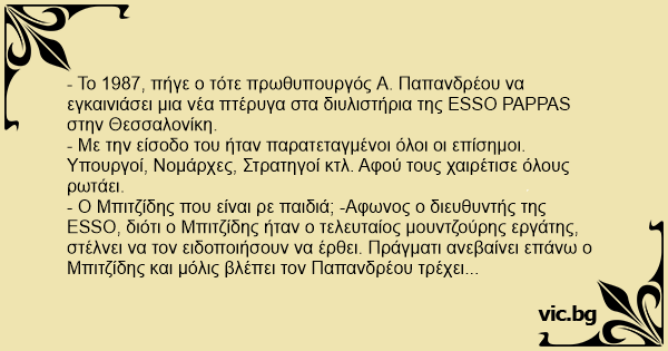- O Μπιτζίδης που είναι ρε παιδιά; -Aφωνος ο διευθυντής της ESSO, διότι ο Μπιτζίδης ήταν ο τελευταίος μουντζούρης εργάτης, στέλνει να τον ειδοποιήσουν να έρθει. Πράγματι ανεβαίνει επάνω ο Μπιτζίδης και μόλις βλέπει τον Παπανδρέου τρέχει και αγκαλιάζονται με συγκίνηση. Αντρέα μου ο Μπιτζίδης, Γιώργο μου ο Παπανδρέου, δάκρυσαν. Το 1991 πηγαίνει ο Μητσοτάκης να εγκαινιάσει την ίδια πτέρυγα.! -Πάλι τα ίδια . Όλοι οι επίσημοι στην σειρά.