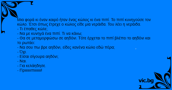 Μια φορά κι έναν καιρό ήταν ένας κώλος κι ένα πιπί. Το πιπί κυνηγούσε τον κώλο. Έτσι όπως έτρεχε ο κώλος είδε μια νεράιδα. Του λέει η νεράιδα.