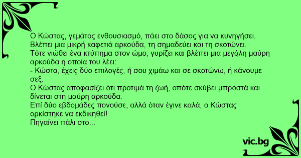 - Κώστα, έχεις δύο επιλογές, ή σου χιμάω και σε σκοτώνω, ή κάνουμε σεξ.