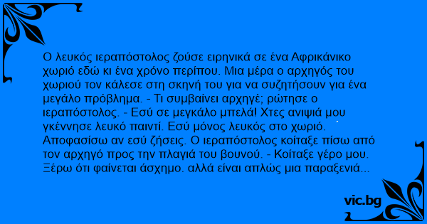 Ο λευκός ιεραπόστολος ζούσε ειρηνικά σε ένα Αφρικάνικο χωριό εδώ κι ένα χρόνο περίπου. Μια μέρα ο αρχηγός του χωριού τον κάλεσε στη σκηνή του για να συζητήσουν για ένα μεγάλο πρόβλημα. - Τι συμβαίνει αρχηγέ; ρώτησε ο ιεραπόστολος. - Εσύ σε μεγκάλο μπελά! Χτες ανιψιά μου γκέννησε λευκό παιντί. Εσύ μόνος λευκός στο χωριό. Αποφασίσω αν εσύ ζήσεις. Ο ιεραπόστολος κοίταξε πίσω από τον αρχηγό προς την πλαγιά του βουνού. - Κοίταξε γέρο μου. Ξέρω ότι φαίνεται άσχημο. αλλά είναι απλώς μια παραξενιά της φύσης. Λέγεται αλβινισμός. Η διαφορετικότητα δε σημαίνει τίποτε. Παντού υπάρχουν εξαιρέσεις. Για παράδειγμα, κοίταξε εκείνο το κοπάδι με τα άσπρα πρόβατα που βόσκουν στο λόφο απέναντι. - Τα βλέπω. - Τότε θα πρόσεξες ότι στο κοπάδι υπάρχει κι ένα μαύρο πρόβατο. Είναι το μοναδικό μαύρο πρόβατο σε όλο το χωριό αρχηγέ. - Εντάξει, εντάξει. Αν εσύ ντεν μιλήσεις, ντεν μιλήσω κι εγκώ, είπε χλωμιάζοντας ο αρχηγός.