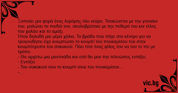 Ξυπνάει μια φορά ένας λυράρης όλο νεύρα. Τσακώνεται με την γυναίκα του, μαλώνει τα παιδιά του, σκυλοβρίστικε με την πεθερά του και τέλος του χαλάει και το αμάξι.