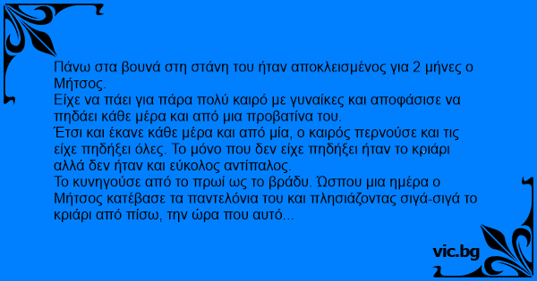 Το κυνηγούσε από το πρωί ως το βράδυ. Ώσπου μια ημέρα ο Μήτσος κατέβασε τα παντελόνια του και πλησιάζοντας σιγά-σιγά το κριάρι από πίσω, την ώρα που αυτό έτρωγε, αρπάζοντας το από τα κέρατα του την έχωσε. Το κριάρι άρχισε να τρέχει αλαφιασμένο αλλά ο Μήτσος το κρατούσε γερά από τα κέρατα.