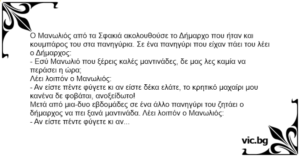 Σε κάθε πανηγύρι ο Μανωλιός έλεγε αυτή τη μαντινάδα. Μια μέρα λοιπόν, αγανακτισμένος ο δήμαρχος του λέει: