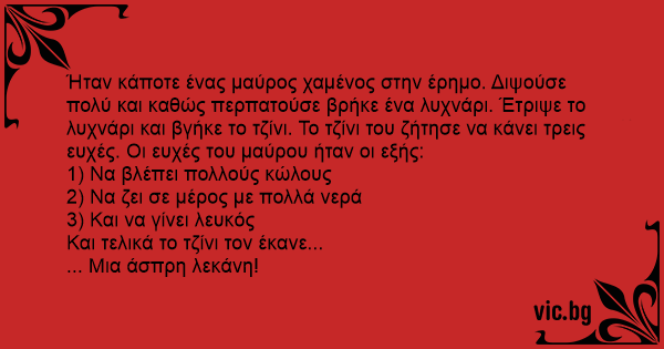 Ήταν κάποτε ένας μαύρος χαμένος στην έρημο. Διψούσε πολύ και καθώς περπατούσε βρήκε ένα λυχνάρι. Έτριψε το λυχνάρι και βγήκε το τζίνι. Το τζίνι του ζήτησε να κάνει τρεις ευχές. Οι ευχές του μαύρου ήταν οι εξής: