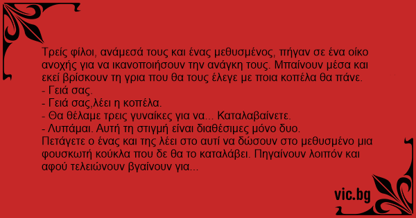 Τρείς φίλοι, ανάμεσά τους και ένας μεθυσμένος, πήγαν σε ένα οίκο ανοχής για να ικανοποιήσουν την ανάγκη τους. Μπαίνουν μέσα και εκεί βρίσκουν τη γρια που θα τους έλεγε με ποια κοπέλα θα πάνε.