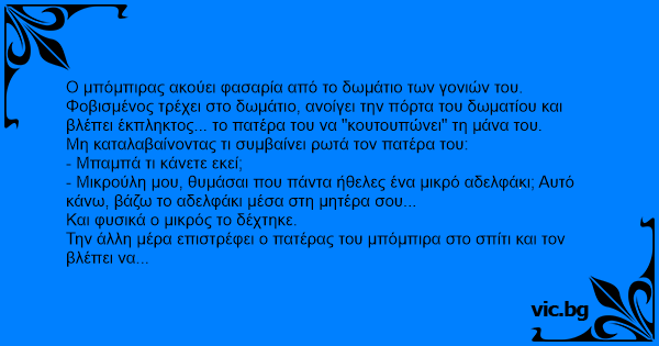 Ο μπόμπιρας ακούει φασαρία από το δωμάτιο των γονιών του. Φοβισμένος τρέχει στο δωμάτιο, ανοίγει την πόρτα του δωματίου και βλέπει έκπληκτος... το πατέρα του να "κουτουπώνει" τη μάνα του.