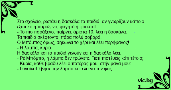 Ρωτάει η δασκάλα τα παιδιά στη τάξη να της πουν το πιο παράξενο φαγητό. Λέει ο Κωστάκης: - Τα κανελόνια κυρία! - Εσύ Ελένη; - Το παστίτσιο. - Για πες μας και εσύ Τοτέ. - Η λάμπα! - Υπάρχει τέτοιο...