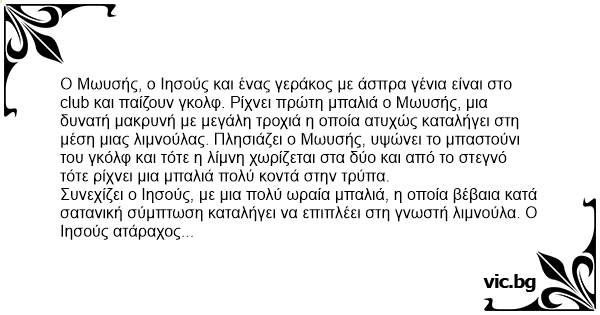 Ο Μωυσής, ο Ιησούς και ένας γεράκος με άσπρα γένια είναι στο club και παίζουν γκολφ. Ρίχνει πρώτη μπαλιά ο Μωυσής, μια δυνατή μακρυνή με μεγάλη τροχιά η οποία ατυχώς καταλήγει στη μέση μιας λιμνούλας. Πλησιάζει ο Μωυσής, υψώνει το μπαστούνι του γκόλφ και τότε η λίμνη χωρίζεται στα δύο και από το στεγνό τότε ρίχνει μια μπαλιά πολύ κοντά στην τρύπα.