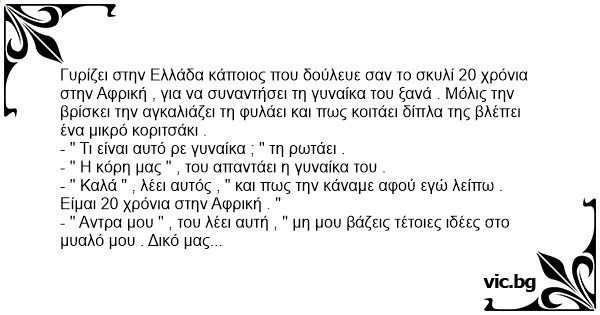- " Καλά " , λέει αυτός , " και πως την κάναμε αφού εγώ λείπω . Είμαι 20 χρόνια στην Αφρική . "