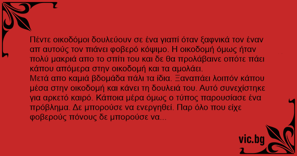 Μετά απο καμιά βδομάδα πάλι τα ίδια. Ξαναπάει λοιπόν κάπου μέσα στην οικοδομή και κάνει τη δουλειά του. Αυτό συνεχίστηκε για αρκετό καιρό. Κάποια μέρα όμως ο τύπος παρουσίασε ένα πρόβλημα. Δε μπορούσε να ενεργηθεί. Παρ όλο που είχε φοβερούς πόνους δε μπορούσε να ανακουφιστεί με τίποτα.