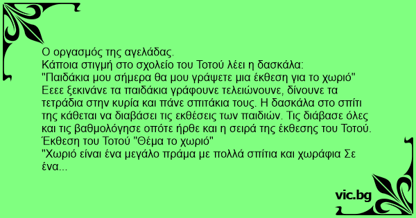 "Ποτάμι είναι ένα μεγάλο μπλε πράμα γεμάτο νερό. Ποτάμια συνήθως βρίσκουμε στα βουνά. Βουνό είναι ένα μεγάλο πράγμα και όπως είπα και στην προηγούμενη μου έκθεση έχει πάνω δέντρα και πέτρες και χώρια σε ένα τέτοιο λοιπόν χωριό μένει και ο θείος μου που έχει μια άσπρη και μια καφέ αγελάδα έναν μαύρο ταύρο αλλά τελικά απ ότι έμαθα ο μαύρος ταύρος κάνει έκπληξη στην άσπρη αγελάδα ... και πη**ει τώρα την καφέ αγελάδα."